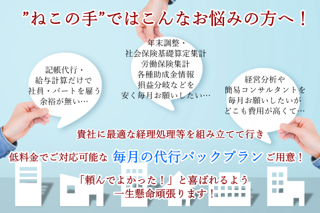 ”ねこの手”は社会保険労務士や他士業とも提携しておりますので諸手続きの完結まで安心してお任せください。